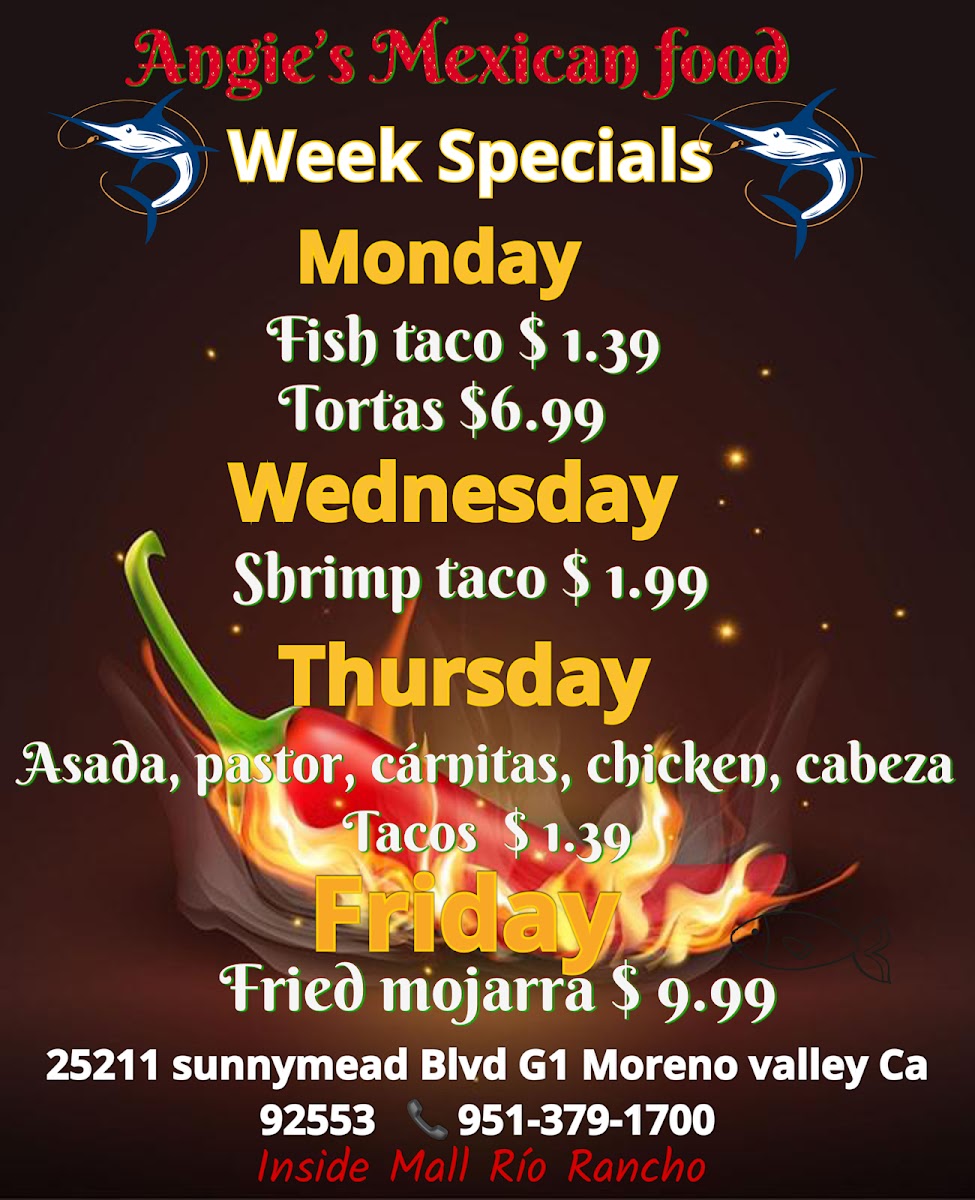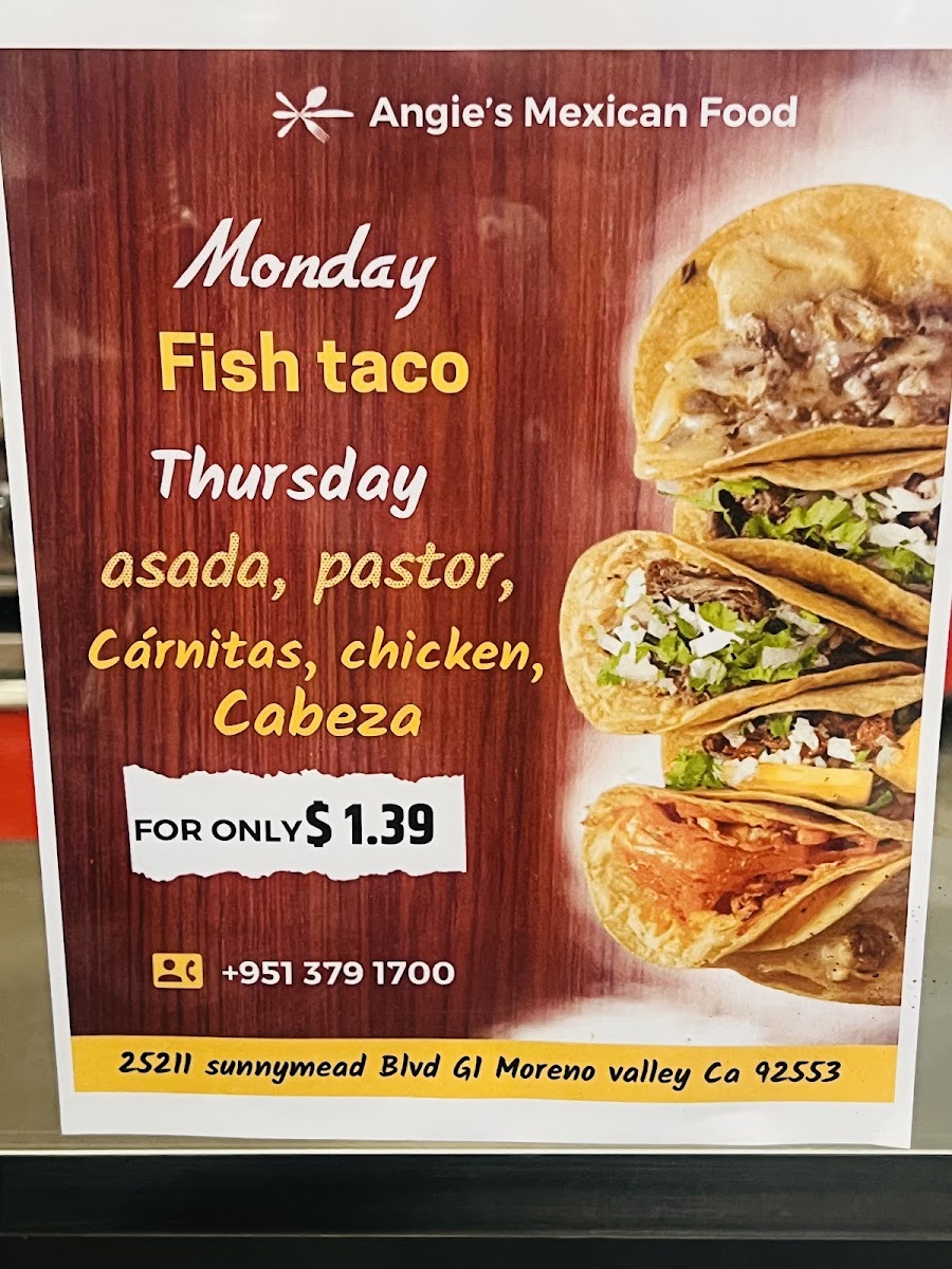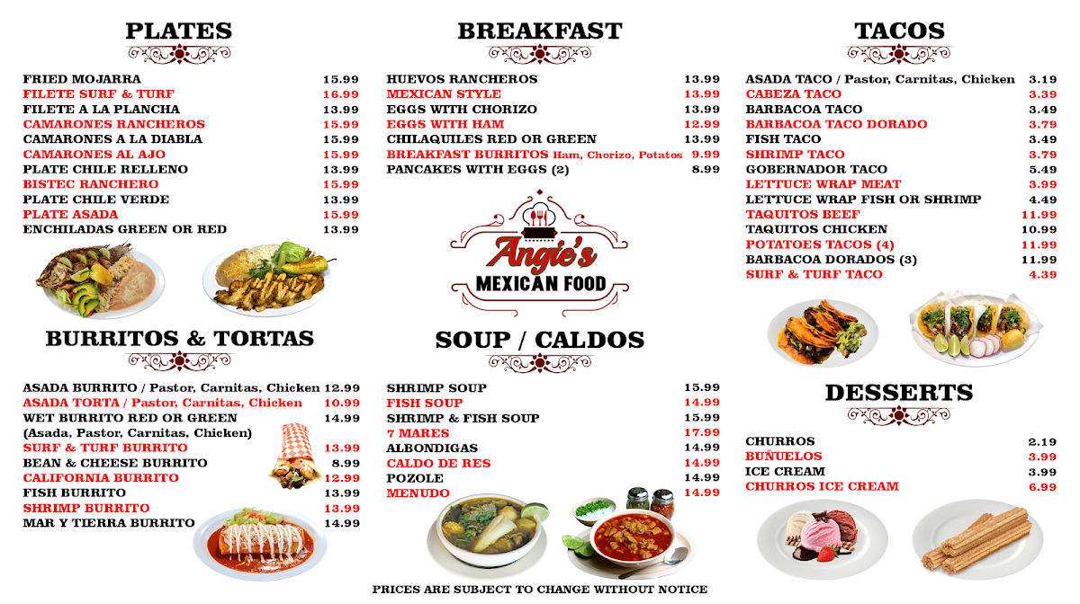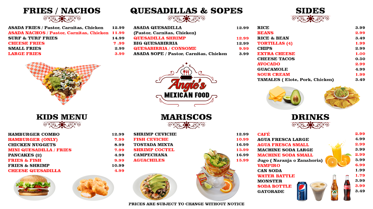 If you’re in the mood for bold flavors and hearty portions, the Angie's Mexican Food Menu is a treasure trove waiting to be explored. From sizzling fajitas that fill the air with mouthwatering aromas to tacos stacked high with fresh toppings, every bite feels like a little fiesta. Don’t miss the enchiladas smothered in rich, savory sauces or the crisp, golden chimichangas that practically melt in your mouth. And if you’re feeling adventurous, the menu’s selection of traditional Mexican specialties, like tamales and chile rellenos, brings a comforting taste of home to the table. Pair your meal with freshly made guacamole or a zesty side of rice and beans, and you’ve got a spread that’s as satisfying as it is colorful. Whether you’re grabbing a quick lunch or settling in for a leisurely dinner, there’s a dish here for every craving, making it impossible not to dive in and sample a little bit of everything.